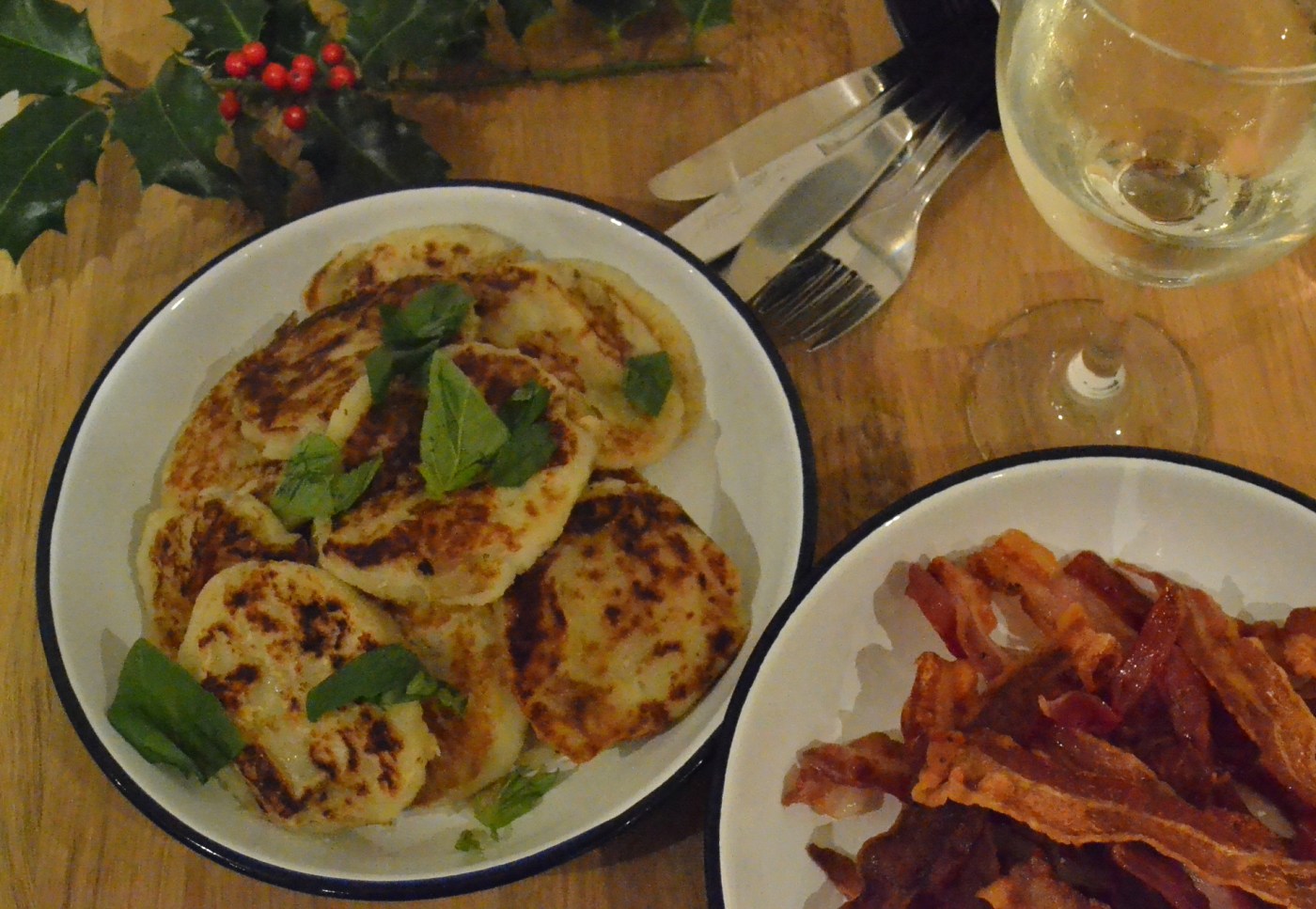 I’d found a yummy sounding recipe for a bean stew and crispy bacon and so I hunted the historic tomes at hand for a suitable carbohydrate-based addition to the meal, this was when I alighted on potato cakes. I’ve been thinking a lot about potato scones the last few days (I mean, who doesn’t?) and so potato cakes seemed to offer a solid substitute for my Scottish craving.
